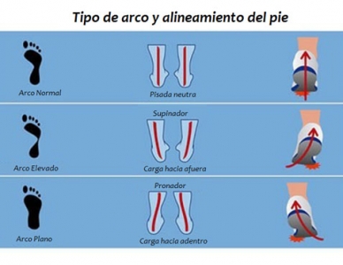 La pisada supinadora (arco elevado, inclinación hacia el exterior) demanda calzado con amortiguación para compensar la falta de pronación natural.