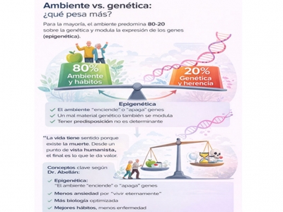 La longevidad depende aproximadamente en un 80% de factores modificables (hábitos, movimiento, alimentación, entorno) y sólo un 20% de la carga genética.