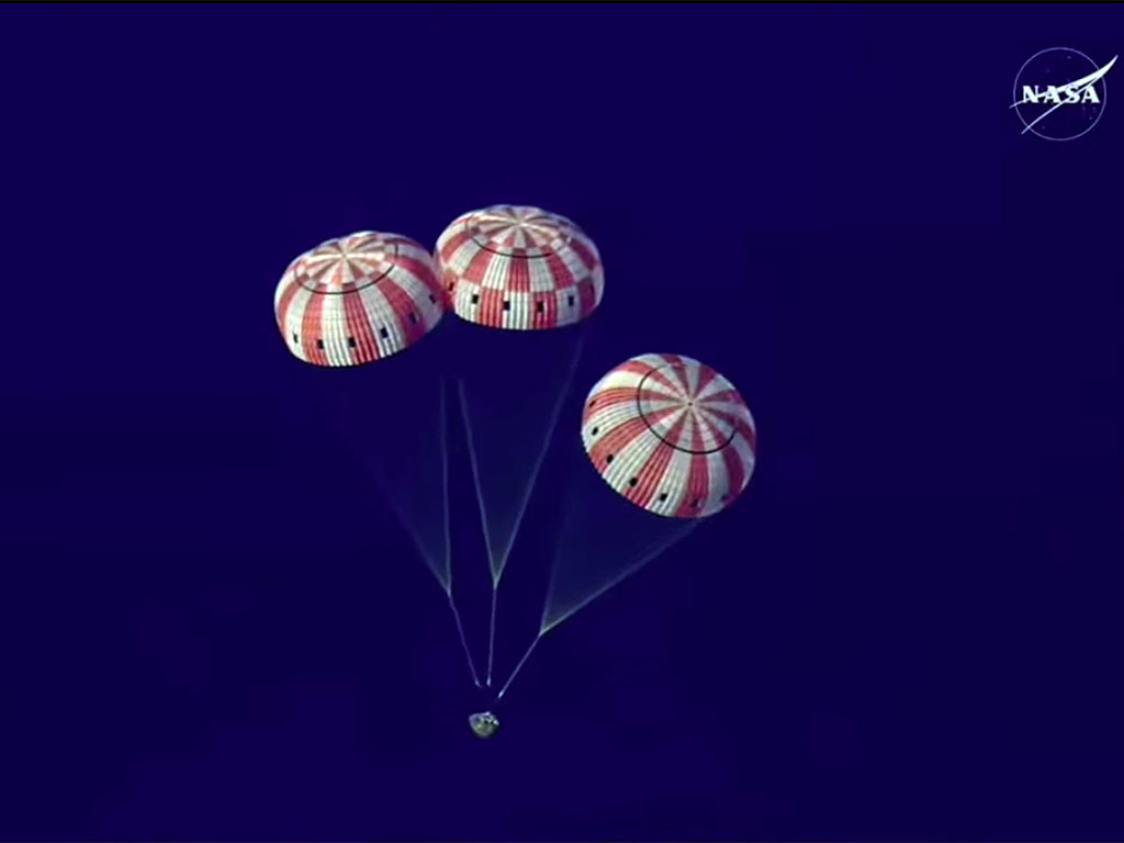 A 8.077 metros sobre el océano, la cápsula redujo su velocidad a 523 km/h gracias al frenado atmosférico. En ese punto, se activaron los sistemas pirotécnicos para el despliegue secuencial de los paracaídas. Primero, tres paracaídas de la cubierta de la bahía delantera de 2,1 metros de diámetro. Luego, dos paracaídas de frenado de 7 metros, y finalmente, a 2.896 metros, los tres paracaídas principales de 35,3 metros de diámetro y 140 kilogramos de peso cada uno. Este sistema desacelera la cápsula a menos de 32 km/h, la velocidad óptima para un amerizaje controlado.