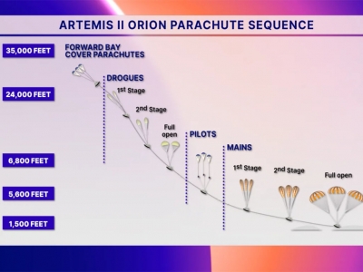 Tras salir del estado de oscuridad, la cápsula Orión se desprenderá de la cubierta de su compartimento delantero, desplegará sus paracaídas de frenado cerca de los 22.000 pies a las 21:03 y, a continuación, desplegará sus tres paracaídas principales alrededor de los 6.000 pies a las 21:04 para reducir la velocidad de la cápsula antes del amerizaje frente a la costa de San Diego a las 21.07.