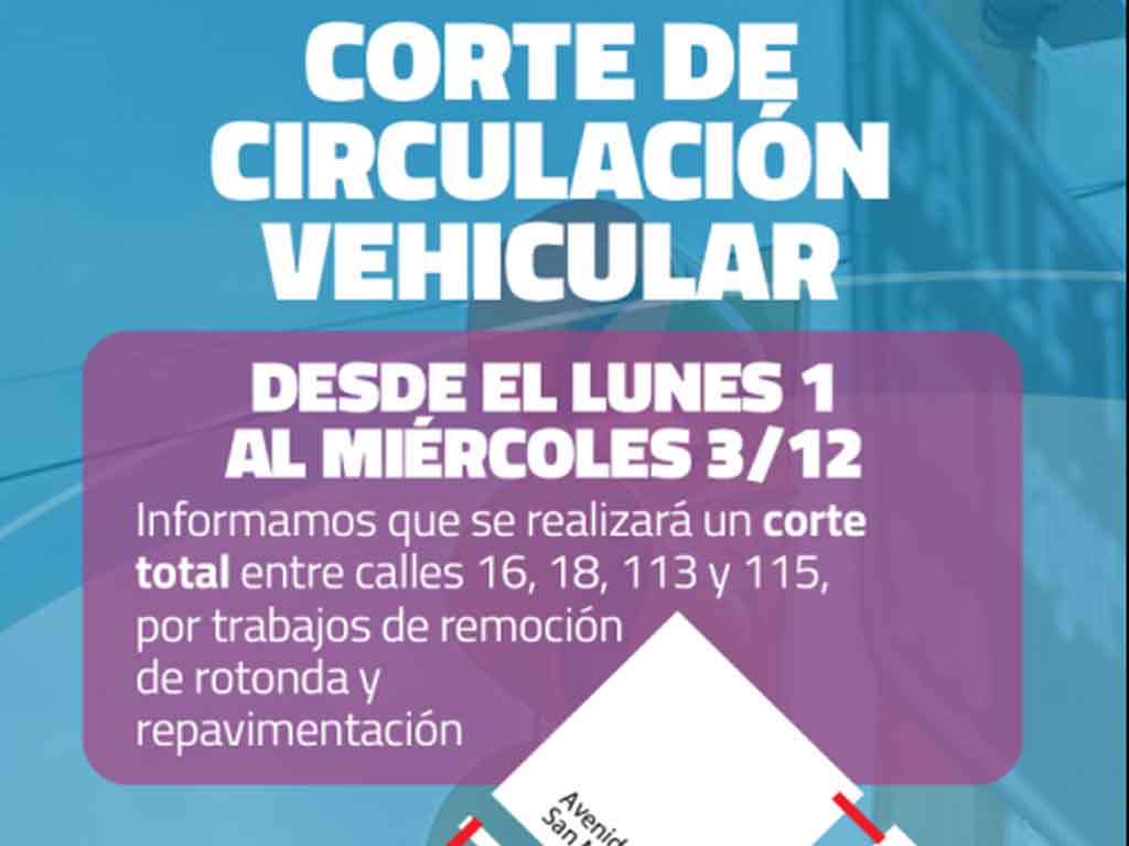 Desde este lunes 1° de diciembre hasta el miércoles 3, se producirá un corte de tránsito por trabajos de remoción de rotonda y repavimentación del sector que comprende la Avenida San Martín y calle 115.
