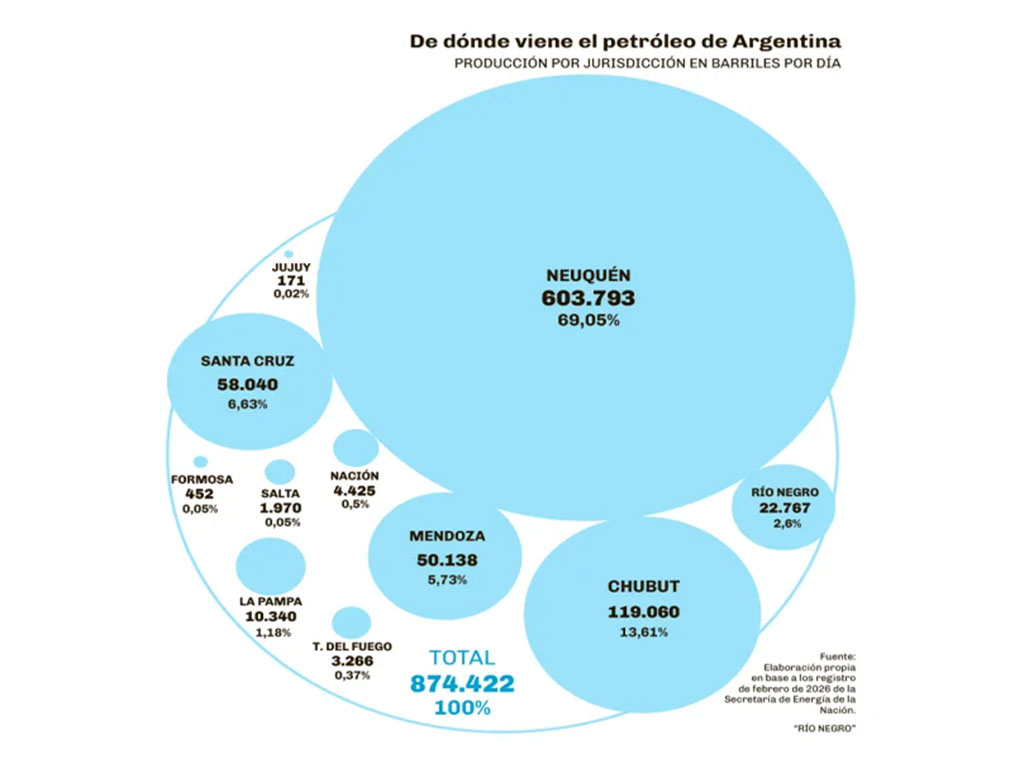 La quinta jurisdicción productora es Río Negro, que aportó 22.767 barriles por día en febrero, un 2,60% del total nacional.