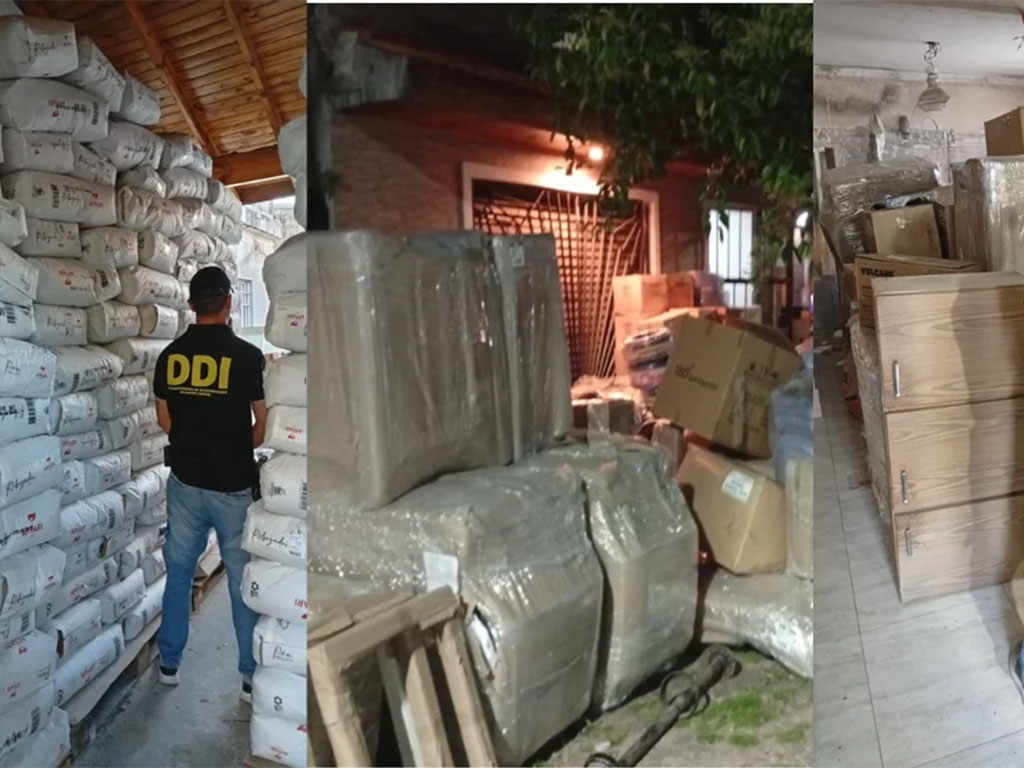 Además de la oficina, se secuestraron siete pallets completos con 554 bolsas de materiales; decenas de bultos y cajas con elementos de construcción; equipamiento gastronómico, mobiliario, iluminación, productos médicos y alimentos; cientos de cajas cerradas, bolsas industriales y bultos sueltos; electrodomésticos, luminarias, muebles y documentación comercial.