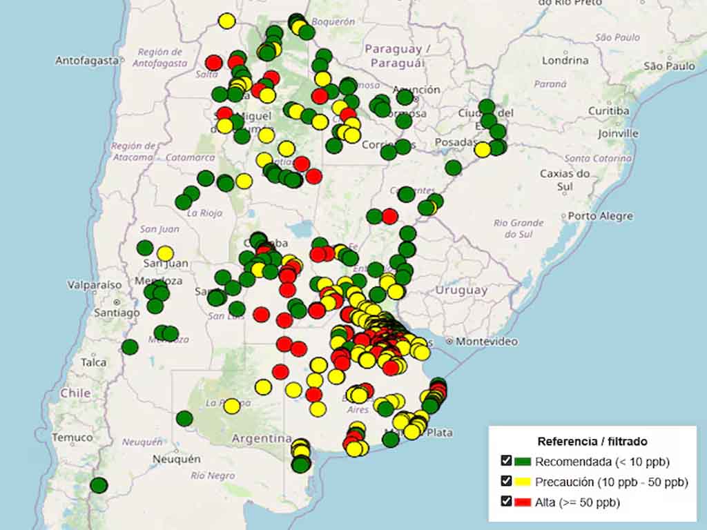 También advierte sobre regiones en “precaución” (amarillo, 10-50 ppb), que se extienden hacia el norte, e incluyen partes del norte argentino, como Santiago del Estero, Chaco y Tucumán. Los puntos verdes, en cambio, representan áreas donde los niveles son inferiores a 10 ppb, considerado el límite seguro, según los parámetros internacionales.