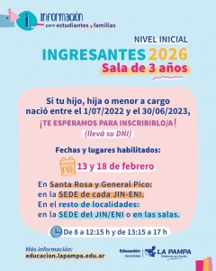 El Ministerio de Educación de La Pampa, a través de la Dirección General de Educación Inicial, comunicó que los días 13 y 18 de febrero se realizarán las inscripciones correspondientes para ingresantes a salas de tres años en 2026.