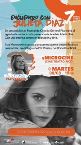 Este martes 8 de agosto a las 15 horas, se desarrollará un Encuentro con Julieta Díaz, en diálogo con Paz Varales, de @cinefilosoficial en el microcine del Cine Teatro Pico.