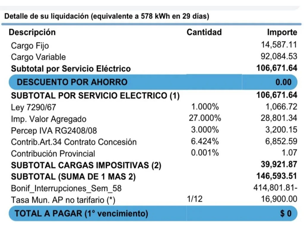 En la factura se observa un consumo elevado con un subtotal de $146.593, pero gracias a una “Bonif_Interrupciones_Sem_58” de $414.801,81, el total a pagar resultó ser de $0, quedando un saldo a favor para los meses siguientes.