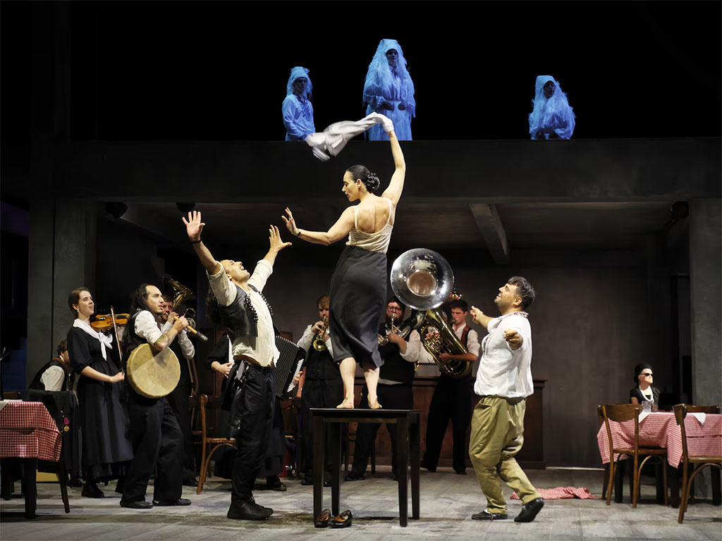 El escenario adopta la forma de una kafana, como se conoce a la taberna tradicional en esta zona de Europa. “El término designa un lugar de libertad absoluta, donde se celebran los grandes y pequeños momentos de la vida”, explica Abramović. “En estos salones-restaurantes todo puede suceder”. Allí, el contratenor Aleksandar Timotić brinda y llora con la viuda de Josip Broz Tito, el líder de la Yugoslavia comunista que dirigió la resistencia partisana contra los nazis. “Uno de los momentos más emocionantes llega con la danza entre albaneses y serbios, enemigos históricos, que acaba convirtiéndose en una declaración de amor”. Los músicos de la banda no se limitan a acompañar las escenas, sino que “subrayan cada gesto del relato” con sus instrumentos.