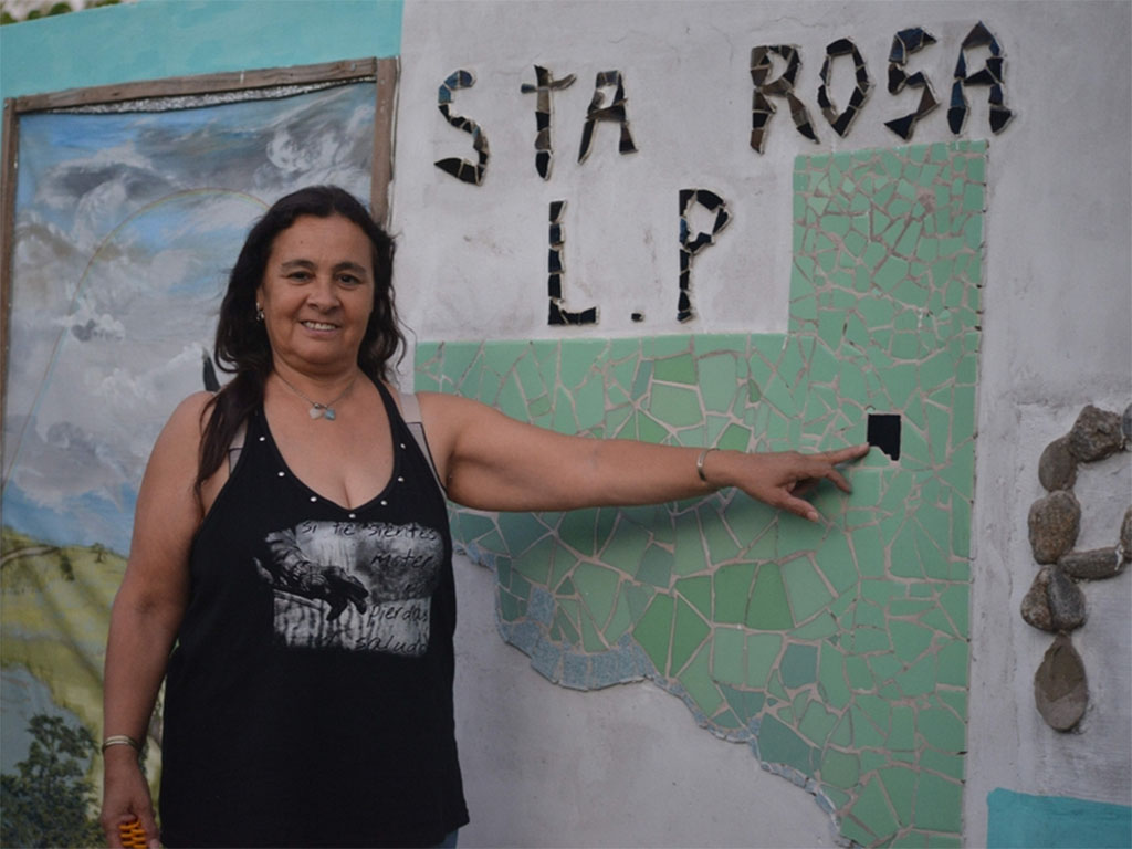 Los distintos rincones del espacio que armó Marta en su casa del barrio Las Artes presentan atractivos, ya sea porque los armó ella con sus manos, o porque tienen mensajes de quienes pasaron por allí para descansar y seguir. Además, con mosaicos dibujó el mapa de La Pampa y resaltó el departamento Capital.