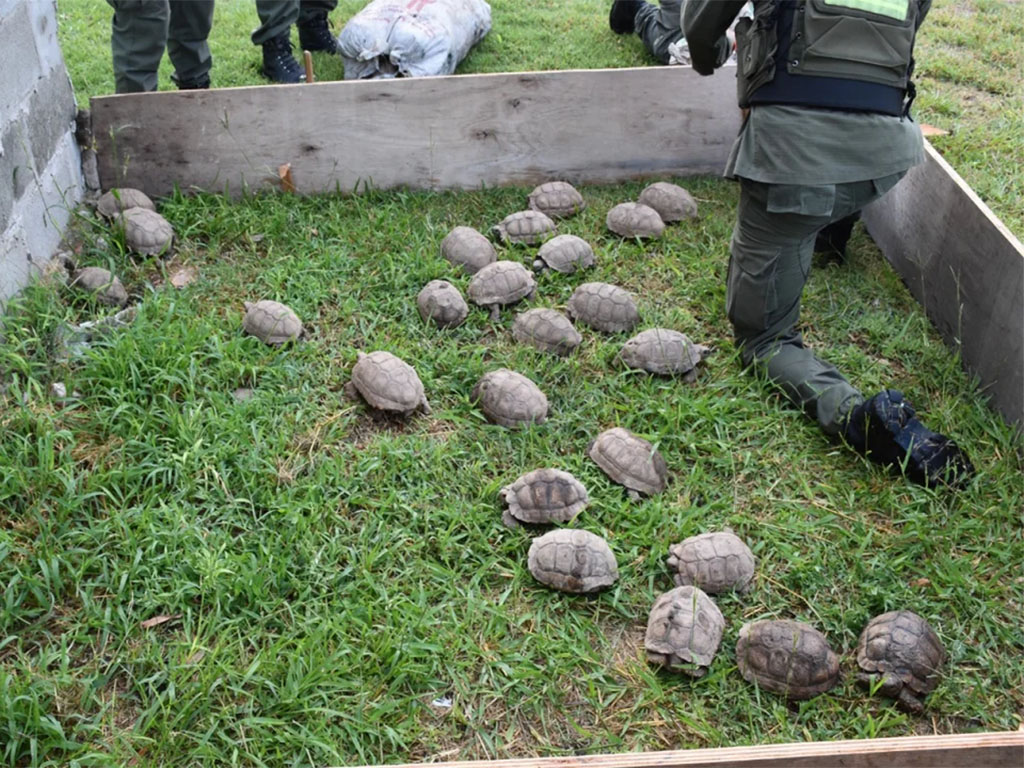 Los uniformados hallaron un total de diecisiete bultos, conformados por cajas de cartón, cajones de madera y bolsas de arpillera, donde se encontraban las tortugas adultas, encimadas unas sobre otras. En total, se contabilizaron 150 tortugas terrestres y 100 loros.