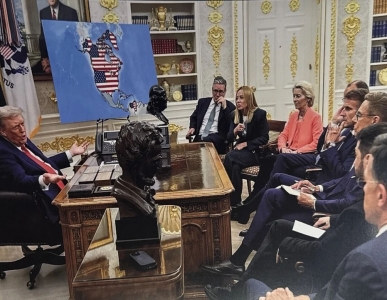 Trump difundió otra imagen en la que se lo ve reunido con líderes europeos en el Despacho Oval, donde se ve un mapa detrás que muestra a Estados Unidos, Canadá, Groenlandia y Venezuela bajo la bandera estadounidense.