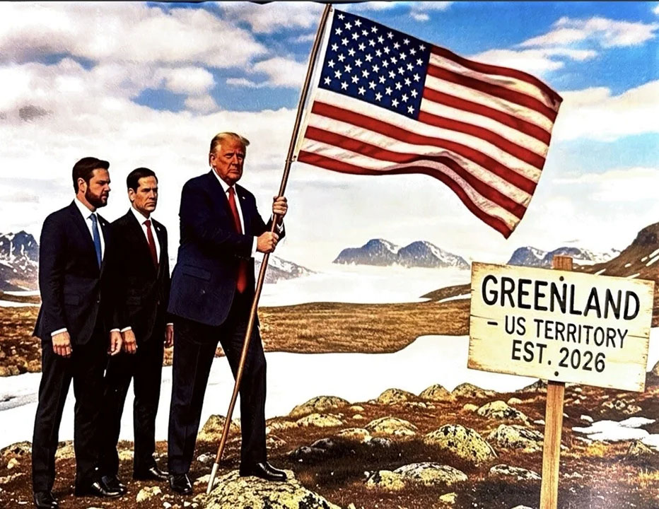 En la foto, el mandatario aparece acompañado por el vicepresidente estadounidense, JD Vance, y el secretario de Estado, Marco Rubio, y se ve un cartel que dice “GROENLANDIA - TERRITORIO DE ESTADOS UNIDOS EST. 2026”.